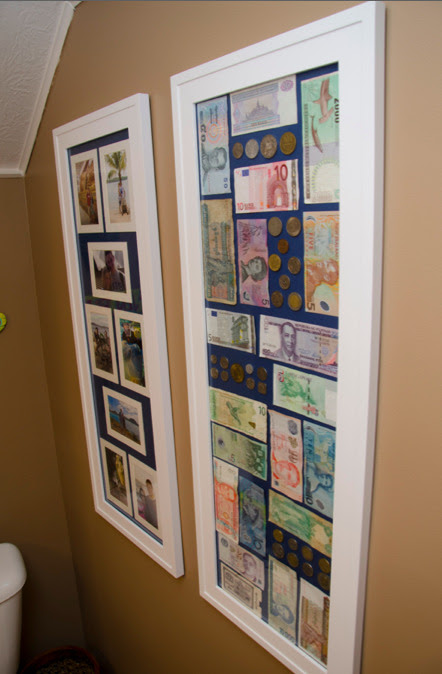 May 9, 2011: Our bathroom remodel is DONE! Click for before/after pictures. The goal was to re-do it all (flooring, pant, sink, baseboards, decorations) under $500, and we made it. We went with a travel theme, using all decorations from countries we’ve been to. My favorite is the “money frame”, which includes bills and coins from all the countries we’ve been to. Total exchange rate on it = $121.05. :)